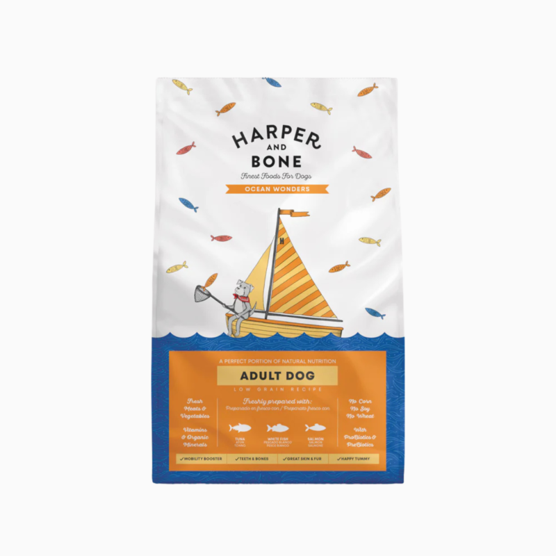 Harper & Bone Adult Dog Ocean Wonders es un alimento completo para perros adultos elaborado con sabrosos ingredientes del mar como fuente principal de proteína. Su receta equilibrada aporta nutrientes esenciales y ácidos grasos omega que favorecen una piel sana, un pelaje brillante y una óptima salud general. Además, incorpora frutas, verduras y superalimentos que ayudan a la digestión y refuerzan el sistema inmunológico, con un sabor delicioso que encantará a tu perro.